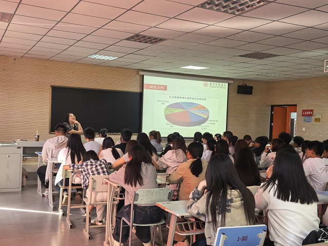 关于就业前景与毕业去向,朱晶晶老师通过数据分享进一步增强新生信心:“近年来,专业毕业生就业率持续稳定,毕业去向涵盖互联网、金融、制造业、咨询服务等多个领域,主要从事招聘专员、培训主管、薪酬绩效经理等岗位,部分学生还通过考研、出国深造实现了学历提升。”