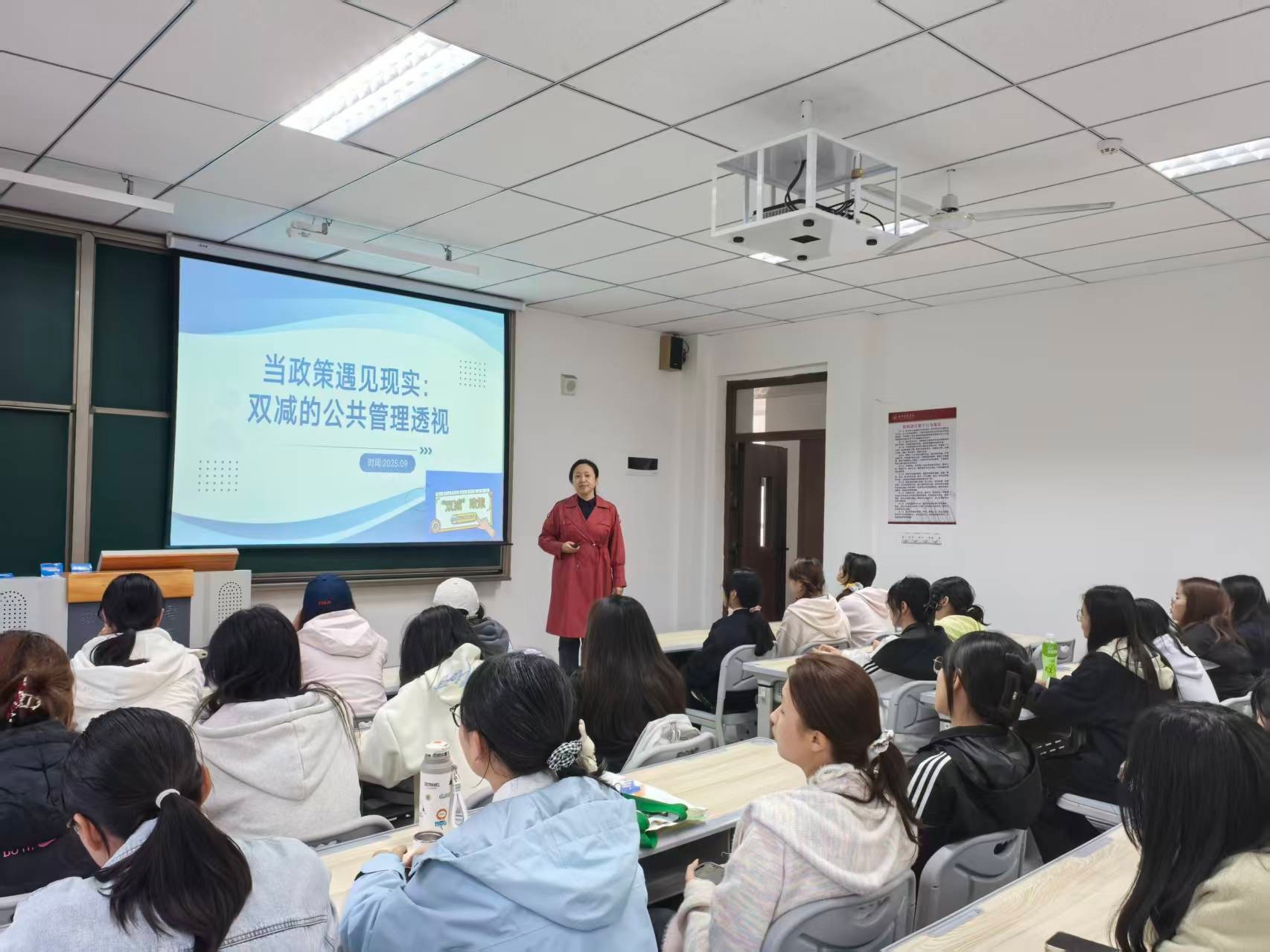 温双艳老师以“双减”政策为切入点,从公共管理的专业视角出发,深入剖析了政策从制定到执行过程中面临的现实挑战。她首先以“我们共同亲历的风暴”为引,引发在场学生对“双减”政策影响的共鸣,进而引导学生以未来公共管理者的身份,理性审视政策背后的治理逻辑。