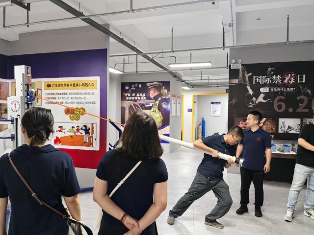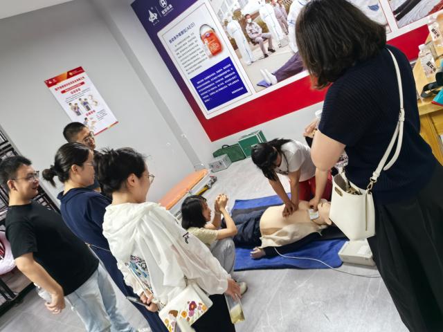 在专业工作人员的讲解下,现场老师体验仿真馆里人体测量仪、消防员训练专用跑步机、消防器材等真实的消防设备。杨瑞平教授与张蕊老师完整的体验了人体测量仪,程建波老师体验消防员专用跑步机、消防器材等,工作人员用现场的模拟道具人引导老师们练习急救方式,大家收获颇丰。