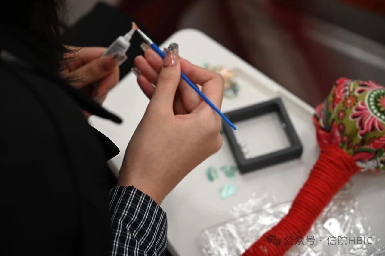 在张老师的指导下,大家迅速自由组队,几人一组并明确分工。不过,制作过程并非一帆风顺,不少小组都遇到了难题。有的同学在粘贴螺钿时,难以调整到合适位置,但在张老师的耐心指导和同学们的相互帮助下,大家积极寻找解决办法。粘贴出现失误的同学,在张老师建议下,巧妙改变设计,将失误之处转化为独特创意。